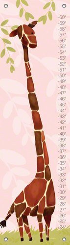 Growth chart featuring a giraffe reaching high into the trees. Our kid's growth charts are created on the same artists canvas as our stretched wall art. Grommets placed in the four corners make them easy to hang. We provide color coordinated decorative covers that easily fit over the screw or nail you choose. This product creates a great childhood keepsake, and rolls up easily for safe storage. The growth chart can be wiped clean with a soft, dry or slightly damp cloth and should it wrinkle, the backside may be ironed on a low setting with light steam. A permanent marker (not included) is a great way to mark dates or ages on the chart.