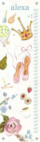 Growth chart featuring items little girls love. Our kid's growth charts are created on the same artists canvas as our stretched wall art. Grommets placed in the four corners make them easy to hang. We provide color coordinated decorative covers that easily fit over the screw or nail you choose. This product creates a great childhood keepsake, and rolls up easily for safe storage. The growth chart can be wiped clean with a soft, dry or slightly damp cloth and should it wrinkle, the backside may be ironed on a low setting with light steam. A permanent marker (not included) is a great way to mark dates or ages on the chart.
