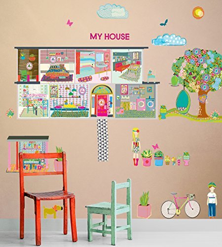 Boho chic oversized wall sticker dollhouse complete with a precocious puppy, a curious cat, a tempting tree swing and pretty pots full of beautiful blooms. These oversized self-adhesive fabric stickers can be removed, repositioned and reused many times. Make a huge impact in your kids room decor in minutes and rest assured that you are using a product that is printed in the USA with non-toxic inks. All children's wall decals have the same great clarity, depth and color resolution as our stretched wall art.