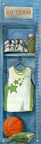 Track your little all-star's height with this basketball locker growth chart. It's stocked with all the gear your little athlete needs for the big game. Score. Our kid's growth charts are created on the same artist's canvas as our stretched wall art. Grommets placed in the four corners make them easy to hang. We provide color coordinated decorative covers that easily fit over the screw or nail you choose. This product creates a great childhood keepsake, and rolls up easily for safe storage. The growth chart can be wiped clean with a soft, dry or slightly damp cloth and should it wrinkle, the backside may be ironed on a low setting with light steam. A permanent marker (not included) is a great way to mark dates or ages on the chart.