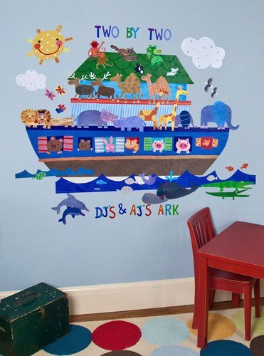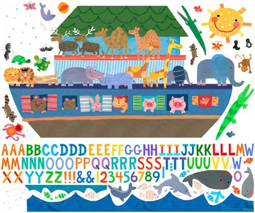 Colorful children's canvas wall sticker set featuring a sturdy boat overflowing with animals two by two ??that can be easily personalized. With 128 pieces, including letters and numbers your child can personalize and create their own whimsical scene one day and a different one the next. Let your child???s imagination or your own be the guide. There are no rules.