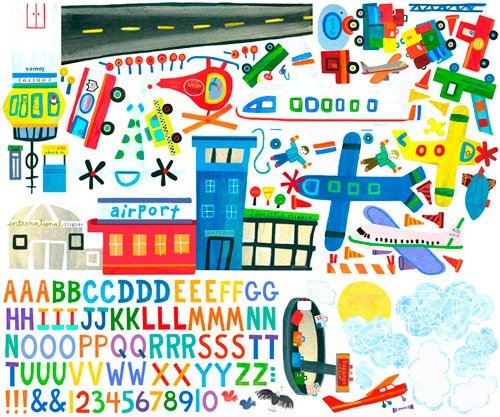 Colorful children's canvas wall sticker set featuring a busy airport complete with baggage cart, air traffic controller and runway that can be easily personalized. With 151 pieces, including letters and numbers your child can personalize and create their own whimsical scene one day and a different one the next. Let your child???s imagination or your own be the guide. There are no rules.