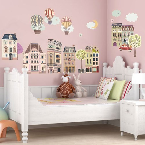 If your little lady enjoys the charm of older homes and the romance of a hot air balloon, our wall decal set will be the wall art of her dreams. Our fabric based decal material is durable and repositionable, so that she can change the landscape whenever she likes. These oversized self-adhesive fabric stickers can be removed, repositioned and reused many times. Make a huge impact in your kids room decor in minutes and rest assured that you are using a product that is printed in the USA with non-toxic inks. All children's wall decals have the same great clarity, depth and color resolution as our stretched wall art.