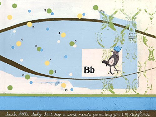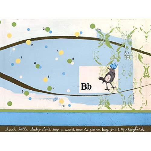 Contemporary nursery art featuring crowned mocking bird on a wire, with words from nursery rhyme. Canvas wall art is reproduced in our San Diego studios using the best digital reproduction method currently available, resulting in great clarity and color saturation. After printing, the canvas is stretched by hand over a custom built 1.5" wood frame. The canvas wraps around the sides providing a finished decorative edge. A saw tooth hanger is attached for easy hanging and artist biography information is included on the back so that children can learn more about today's working artists. Canvases are exceptionally durable and can be cleaned with a soft, dry or slightly damp cloth.