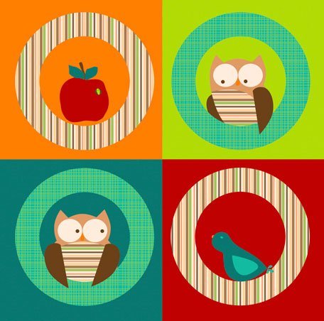 Mod owls and birds sit on their circular perches in this adorable stretched wall art. Canvas wall art is reproduced in our San Diego studios using the best digital reproduction method currently available, resulting in great clarity and color saturation. After printing, the canvas is stretched by hand over a custom built 1.5" wood frame. The canvas wraps around the sides providing a finished decorative edge. A saw tooth hanger is attached for easy hanging and artist biography information is included on the back so that children can learn more about today's working artists. Canvases are exceptionally durable and can be cleaned with a soft, dry or slightly damp cloth.