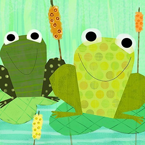 Children's collage wall art featuring two green frogs on lily pads. Canvas wall art is reproduced in our San Diego studios using the best digital reproduction method currently available, resulting in great clarity and color saturation. After printing, the canvas is stretched by hand over a custom built 1.5" wood frame. The canvas wraps around the sides providing a finished decorative edge. A saw tooth hanger is attached for easy hanging and artist biography information is included on the back so that children can learn more about today's working artists. Canvases are exceptionally durable and can be cleaned with a soft, dry or slightly damp cloth.