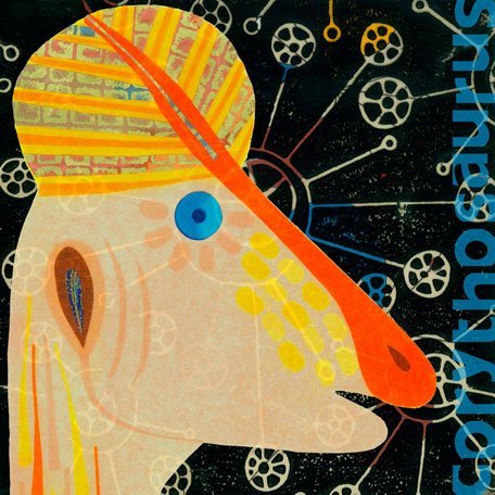 Kid's wall art featuring a colorful corythosaurus. Canvas wall art is reproduced in our San Diego studios using the best digital reproduction method currently available, resulting in great clarity and color saturation. After printing, the canvas is stretched by hand over a custom built 1.5" wood frame. The canvas wraps around the sides providing a finished decorative edge. A saw tooth hanger is attached for easy hanging and artist biography information is included on the back so that children can learn more about today's working artists. Canvases are exceptionally durable and can be cleaned with a soft, dry or slightly damp cloth.