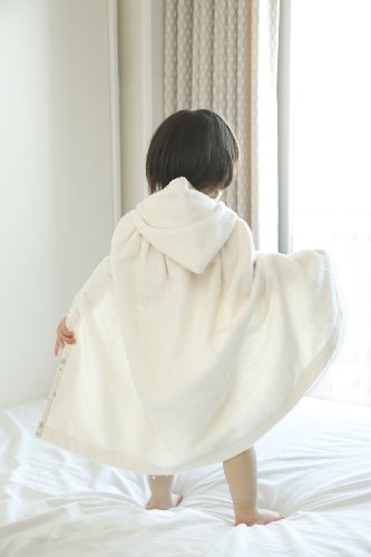 生地はもちろん縫い糸もオーガニックコットンを100%使用しています。ポンチョタイプのバスローブでいやがる赤ちゃんにも素早く着せられます。程よい厚みのパイルなので、拭きやすく、乾かしやすいです。バスローブは赤ちゃんが生まれてから2歳過ぎまで使用出来るので出産祝いのギフトとして喜ばれるアイテムです。ボタンは天然の木製を使用、パイピングの綿テープもオーガニックコットンでノンホルマリンのオリジナルプリントのものを使用しています。 裏側の首周りに付けたテープもオーガニックコットンです。 生後1ヶ月?24ヶ月ぐらいまでお使い頂けます。オーガニックコットンで作った、バックでラッピングしています。バックはエコバックとしてご使用頂けます。