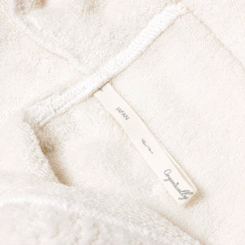 生地はもちろん縫い糸もオーガニックコットンを100%使用しています。ドルマンスリーブで袖が通しやすく、赤ちゃんが脱着しやすいバスローブ。オーガニックコットンの「ペコラ」という羊の毛のようにもこもことした波打つパイル生地を使用しました。高級感のある程よい厚みのパイルなので、肌触りがよく、拭きやすく、乾きやすい生地です。バスローブは赤ちゃんが生まれてから2歳過ぎまで使用出来るので出産祝いのギフトとして喜ばれるアイテムです。スナップボタンはエコテックス認証の安全性の高いものを使用しています。スナップボタンの内側にはオーガニックコットンとオリジナルのノンホルマリンプリントを施した綾テープをあしらいました。 オーガニックコットンで作った、バックでラッピングしています。バックはエコバックとしてご使用頂けます。