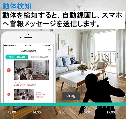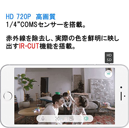 - カメラの映像に動きがあったときにはスマホに通知を行う動体検知機能も搭載で、動き検出ビデオクリップを受信する。スマホやSDカードへの画像保存や録画、ビデオが直接みえる。高い敏感度の検出、異常発生の場合は、検知したアラートはスマートフォンやタブレットへプッシュ通知することができます。
