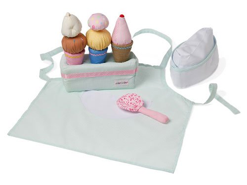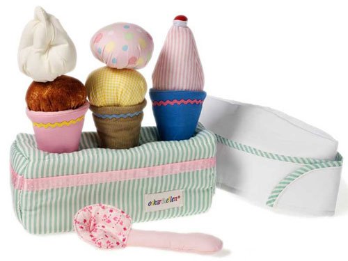 スウェーデンのファブリック・トイ・メーカーOskar&Ellen(オスカー&エレン社)の布製のおままごと用アイスクリームセットです。帽子やエプロンもセットになっていますので、本格的なアイスクリーム屋さんごっこが楽しめます。 アイスはマジックテープでくっつけたり、はがしたりできます。 お友達をさそって、楽しくアイスクリームパーティーをしましょうね。 子供たちのごっこ遊びは想像力と協調性を育みます。 パッケージは可愛いメッシュバッグになっています。
