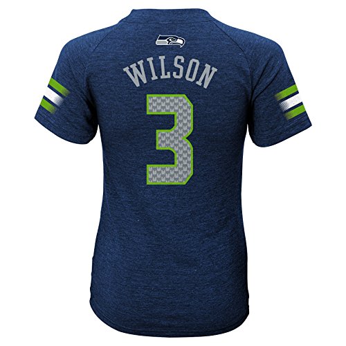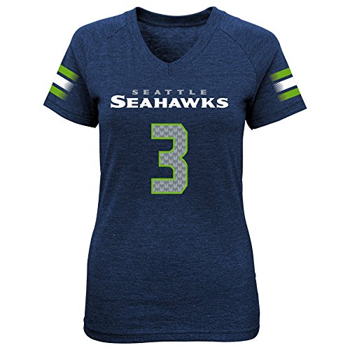 NFLシアトルシーホークスメインウィルソンGirlsラッセルストライプVネックPlayer Name & Number半袖Tシャツ、スモール(7 – 8)、ダークネイビー