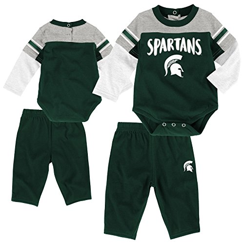 ここミシガン州立大学Outfitそれは、世界中のすべてのスパルタファンのハートをゲットすることなののレイヤードコットンワンジーは、スクリーン印刷は、公式チームカラーとロゴ。お揃いのパンツの特徴は、快適な伸縮性ウエストバンドが付いています。ミシガン州立幼児衣料サイズのまま。