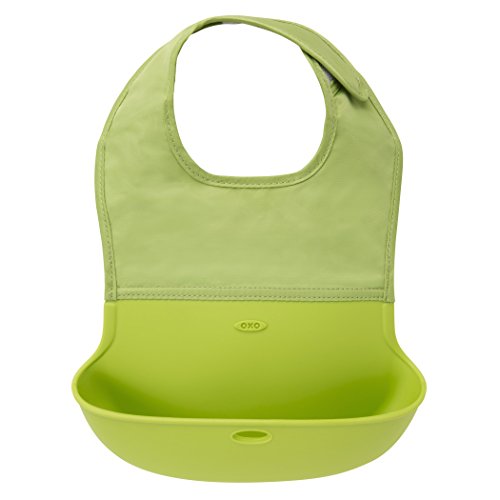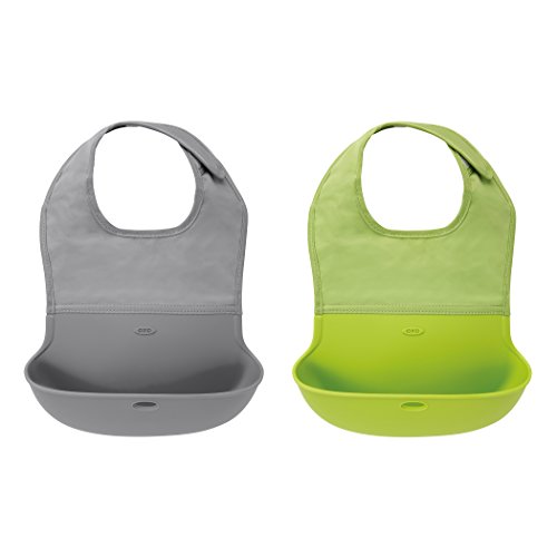 OXO Tot Waterproof Silicone Roll Up Bib with Comfort-Fit Fabric Neck, 2 Pack, Gray/Green