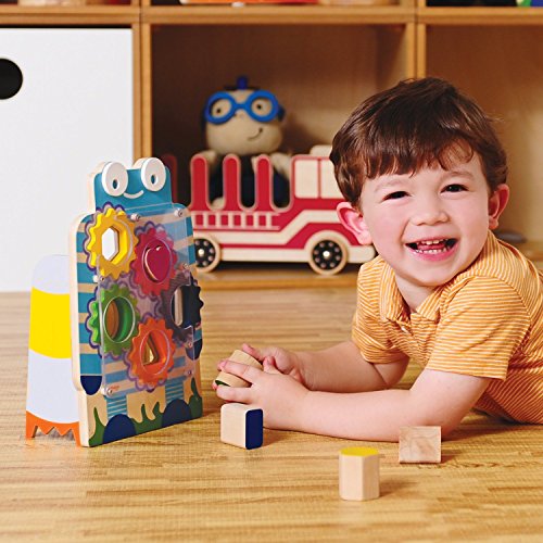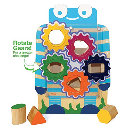 Shift problem-solving into high gear, with this ingenious take on the classic wood shape sorter! Besides matching shapes and colors, kids must turn the interlocking gears just right to fully open up the holes. (The gears have an extra secret to discover: align the heart-shaped gear correctly, and the other gears line up, too!) The blocks drop inside with a pleasing 'thunk,' then slide out the chute on the side. Let's do it again! For ages 12 months and up. This educational toy develops fine-motor coordination, shape, color, and spatial recognition, and analytical thinking Made of birch wood; finished with non-toxic, water-based paint Shape sorter is 7 1/2'L x 3 1/2'W x 11'H; each of the five blocks is roughly 1 1/2' cubed