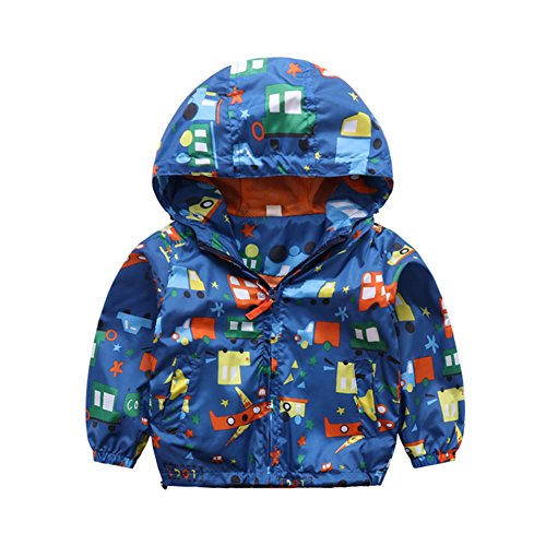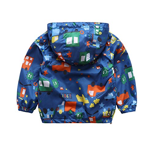 PANCY 子供服 春秋冬 防風 コート フード付き パーカ 男の子 女の子 立て襟 風抜け 可愛い 車柄(ネイビー,110cm)