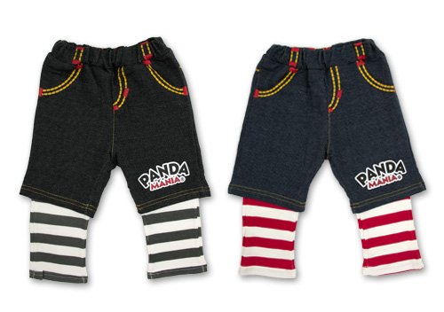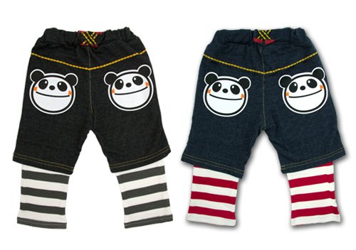 大人気パンダマニアのおしりのプリントがCUTEなレイヤードパンツです。 見た目はデニムのようだけど、ニットならではの風合いストレッチ性を兼ねたデニムニット使用。 ボーダー部分は保湿性・伸縮性に優れたスムス素材 使用 前はベルトやポケットがついているようなプリントと左足のロゴでシンプルに シンプルなデザインだからボーダー部分が映えるね 後はかわいいパンダちゃんフェイスが左右についていてとってもCUTE☆ お色は ブラック(グレー×ホワイトボーダー) と ネイビー(レッド×ホワイトボーダー) の2色展開です サイズ: 80/90/95 カラー: ブラック/ネイビー 素材: 本体・綿60% ポリエステル40% 下パンツ部分・綿100% 原産国: 中国