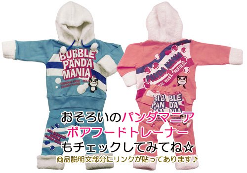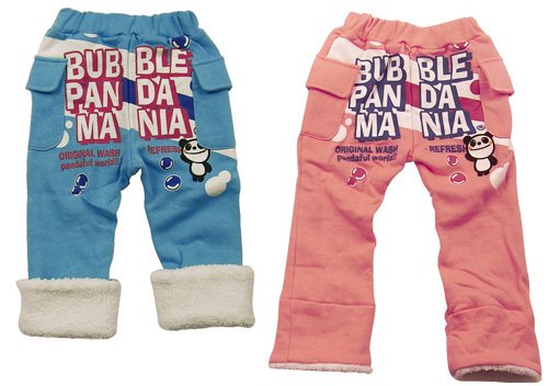 ↑モバイルページはこちら超人気パンダマニアのバブルパンダマニアボアパンツです すそををのままにしてシンプル☆すそを折ったらボアでもこもこ☆ 2通りの履き方が楽しめちゃうよ 大きめの左右ポケットもチャームポイントだね(*^m^*) おしりの大きなバブルパンダマニアの発泡プリントもとってもかわいいっっ(*^0^*) 色はブルー、ピンクの2色展開 お揃いのフード付きトレーナー (←クリックしてね☆)もご検討下さい(*^o^*) サイズ: 80/90/95 カラー: ブルー/ピンク 素材: 本体・綿100% リブ・綿95%、ポリウレタン5% ボア・ポリエステル100% 原産国: 中国