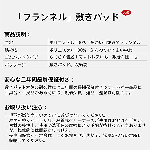 - ◆<アップグレードした素材>:毛羽部分は触れるとあたたかい、極上タッチのフランネルを敷きパッドにしました。フランネルは、きめ細かい毛並みとふんわり心地が魅力です。とってもやわらかくて暖かいため、寒い時期に欠かせない生地の一つです。充填にはクッション性と保温性に優れた中綿を使用して、ふんわり心地よい寝心地を実現しました。ボリュームたっぷりの中綿は、下から冷えをブロックします。