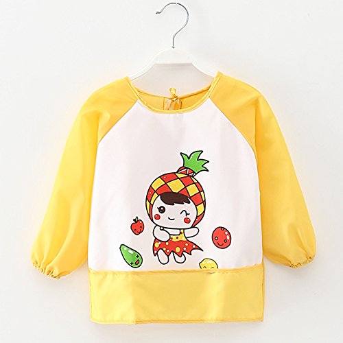ベビービブ ベビーエプロン 長袖 防水 子供 赤ちゃん 女の子 男の子 カートンプリント 可愛い 食事用 (イエロー)