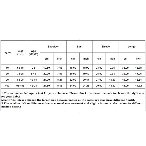 70cm:身長:65-75cm、肩幅:19cm、着丈:35cm、バスト:48cm、袖丈:23cm、年齢:0~6ヶ月