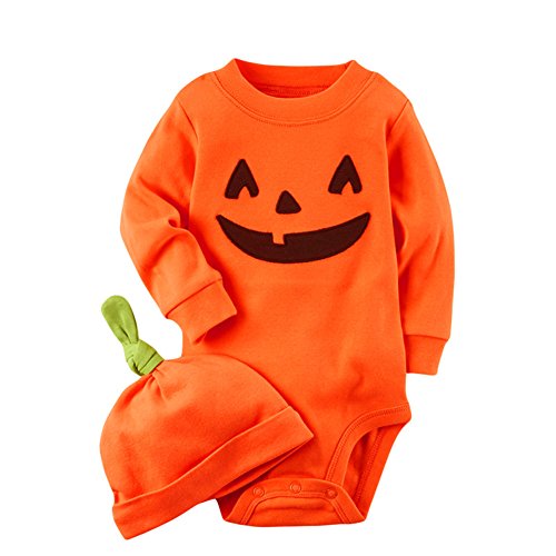 ロンパース ベビー服 キッズ カバーオール ハロウィン カボチャ顔 帽子付き 2点セット セットアップ 可愛い 赤ちゃん服 子供服 1-3歳に設定 (90)