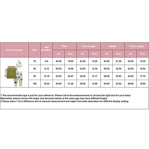70、年齢0-6ヶ月、バスト48cm、上着長さ32cm、ヒップライン54cm、パンツ長さ39cm