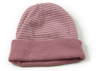 渋いピンクのシンプルなボーダーニット帽。実際のサイズ表記は47-49cmです。若干毛羽立ちがありますが目立った汚れのない良品です。