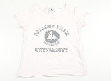 マリンテイストの夏らしいデザイン。実際のサイズ表記は2ans/86cmです。全体的に色褪せがあり、前見頃の裾あたりに薄っすらシミがありますが目立った汚れのない良品です。