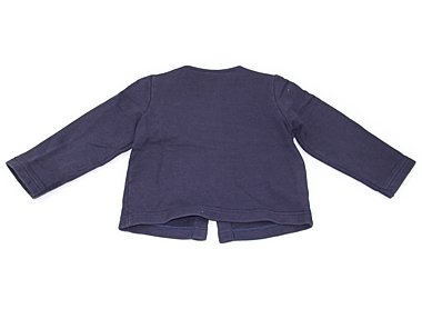 実際のサイズ表示は102cmです。トレーナー素材のカーディガンです。毛羽立ち感と衿元やボタン付近に色落ちがありますが、まだまだ普段着として活躍してくれそうです。