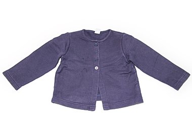 - 実際のサイズ表示は102cmです。トレーナー素材のカーディガンです。毛羽立ち感と衿元やボタン付近に色落ちがありますが、まだまだ普段着として活躍してくれそうです。