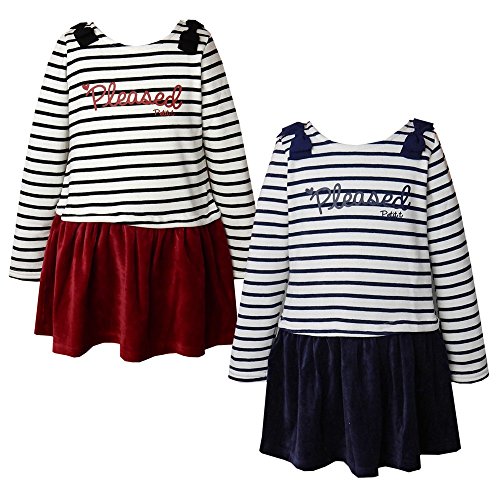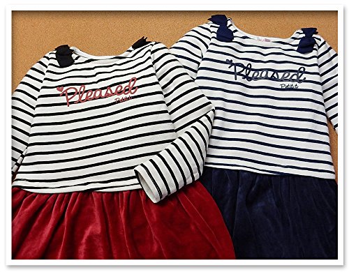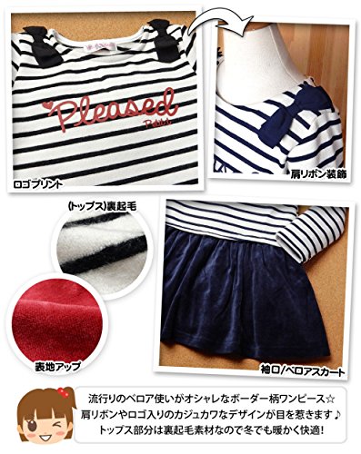 (ネイビー/100cm)子供服 女の子 ドッキング ワンピース 長袖 裏起毛 トレーナー ボーダー柄 ベロア スカート 肩リボン付 女児 キッズ