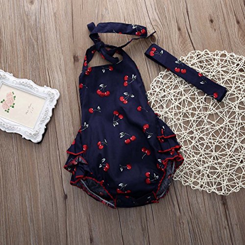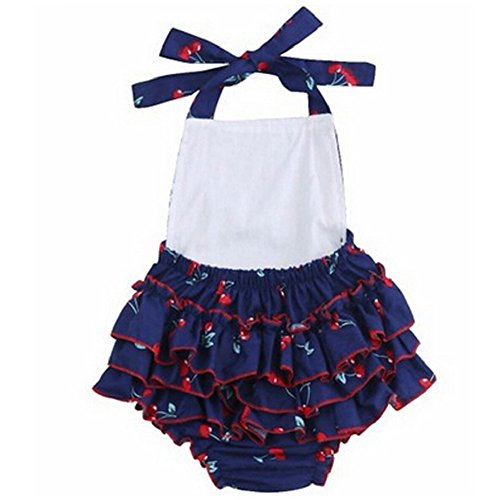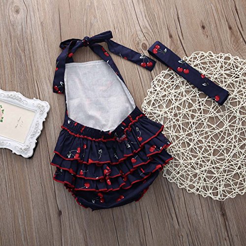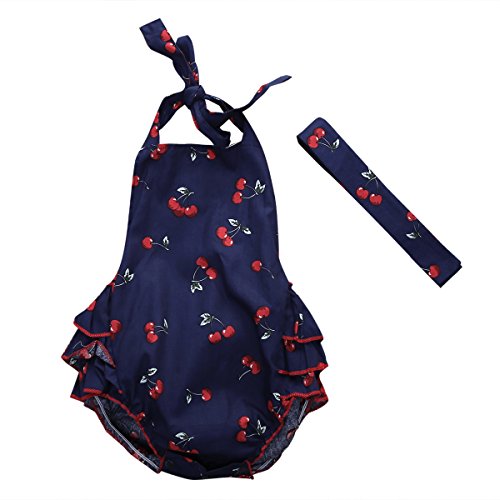 ベビー服 ガール ロンパース ホルターネック レイヤード フリル ブルマ チェリープリント ヘッドバンド付き (70(0-6月), 青)