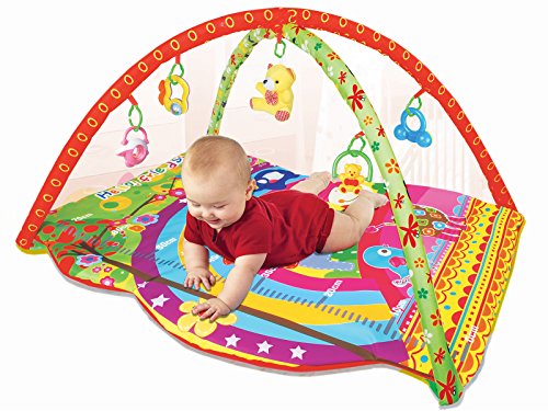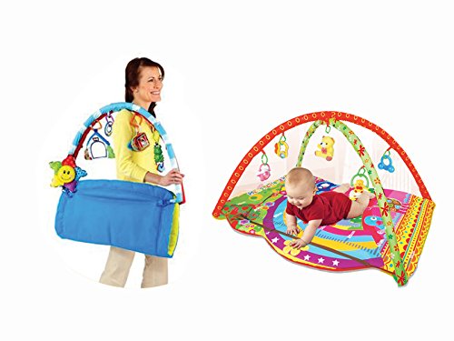 Three modes of play: Sit and play, tummy time and overhead discovery.;Plush bear toy and other classic rattle toys.;Colorful soft mat with giraffe cartoon and height measure.;Folds up compactly for easy carry, storage or travel.;Comes in easy-to-open recyclable packaging.