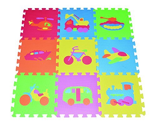 Imagination, Creative Games, Early Education; Visual Sensory Development & Hand Eye Coordination; Safe, soft and durable; Easy to use with colorful interlocking tiles; Easy to clean with damp cloth & mild soap; Non-Toxic, tested FREE of Lead, BPA's and Phthalates; Meet or exceed the US regulated toy safety standards; 9 tiles, Transportation Puzzles colorful EVA foam mat; 6 colors: Red, Yellow, Green, Blue, Orange, Pink; Tile size: 12" x 12" x 0.4" (315mm x 315mm x 10mm); Cover area: 9 SQ. FT. (approx. 0.85 SQ. M);