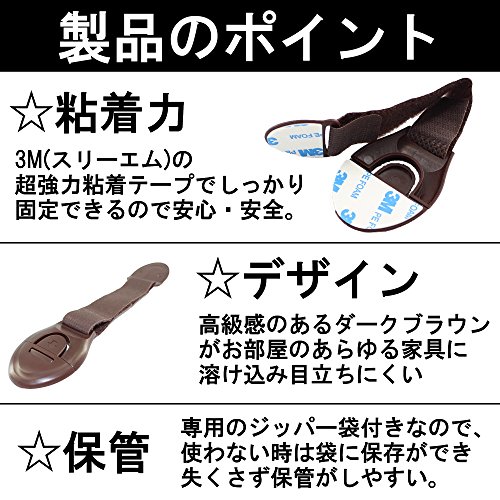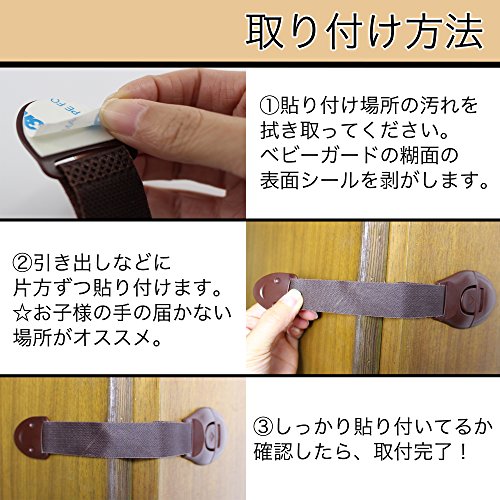★子供のイタズラ、ケガ防止に★ 好奇心旺盛な赤ちゃんにとって、家の中はおもちゃのように興味がある物だらけ。 あんぜんな物と危険な物の区別がつかないので本当に心配ですよね! そんな心配をお持ちならこのベビーガード 大人にとっては簡単な操作ですが、赤ちゃんには開けられない作りで、非常に使いやすいベビーガードストッパーです。 ★高級感あるシンプルなデザイン★ 観音開きの扉、引き戸、引き出し、なんでも使えます。色も、家具に馴染んで、とても良いです。 ★様々場所に設定可能★ シンプルな構造となっておりますので、ご家庭のあらゆる場所に設置が可能です。 地震対策としても重宝頂けると幸いです。 ★ベビーガード取り付け方★ 1.ベビーガード ストッパーをご利用する前に取り付け面のホコリ・汚れ・湿気・油分はしっかり拭き取りましょう。 2.両面テープのはくり紙をはがして、取り付け面にしっかり貼り付けましょう。最後に粘着部分を押さえつけて、しっかり固定されていれば完了です。 3.取り付け後は24時間ほど放置してから使用してください。 4.手でテープ粘着面を触らないでください。