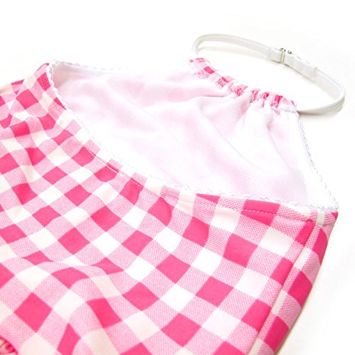 - ピンクの色鮮やかなギンガムチェックにガーリーペプラム、フリルスカートのスイムウェア。