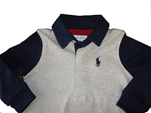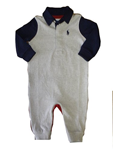 POLO RALPH LAUREN(ポロラルフローレン) ベビーロンパース 6か月用 表側は、グレーとネイビー、裏側はレッドとネイビー、ポロマークのワンポイントはネイビーです。 股下が、開きます。
