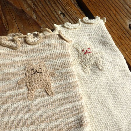 端のメロー加工や手編みモチーフがかわいい、 ギフトにも喜ばれるアイテム。