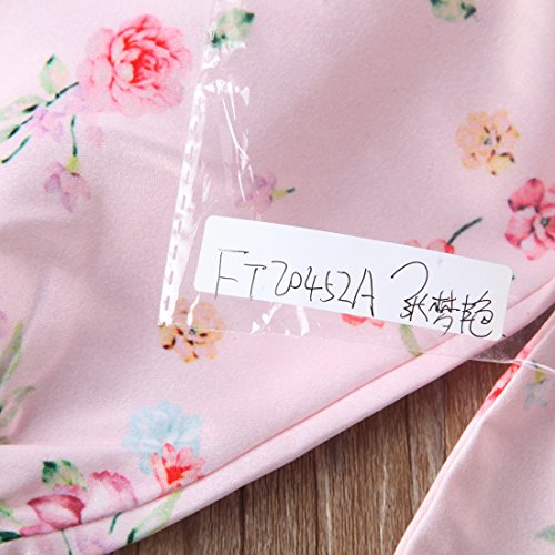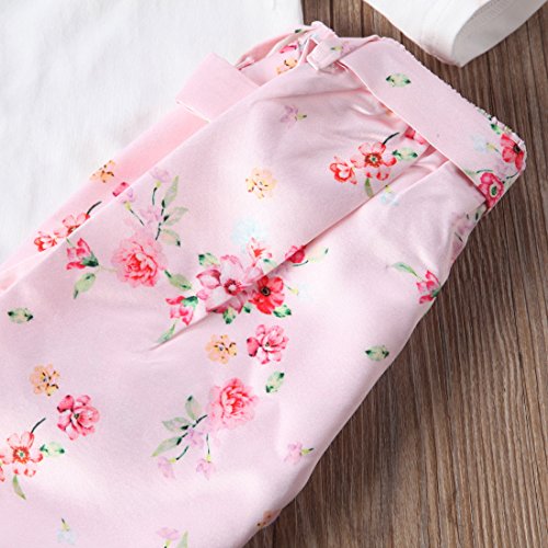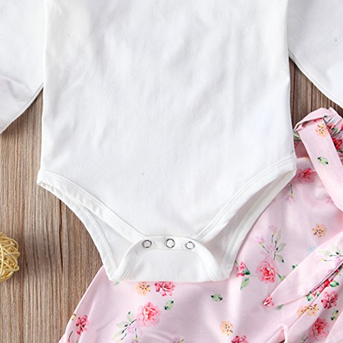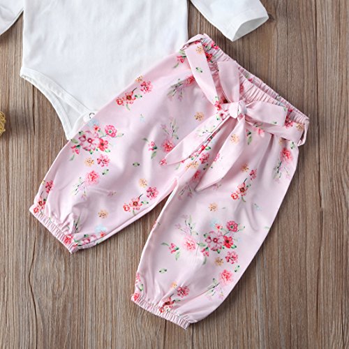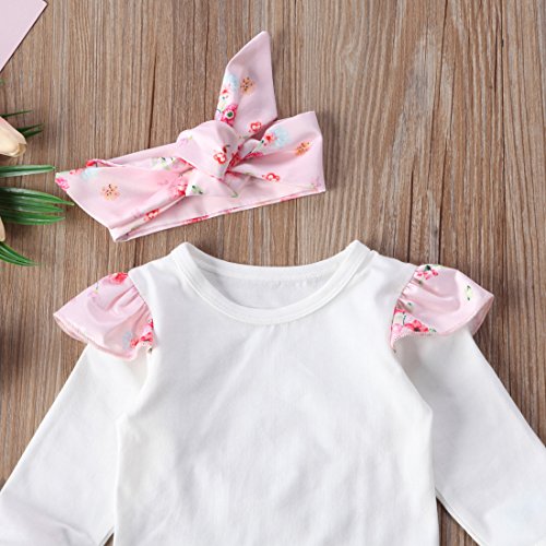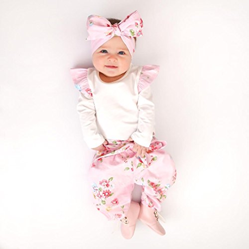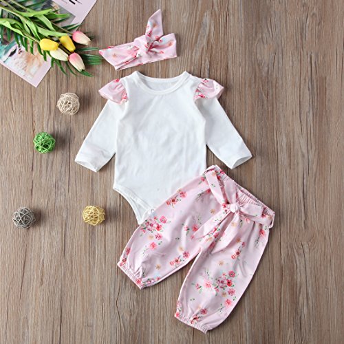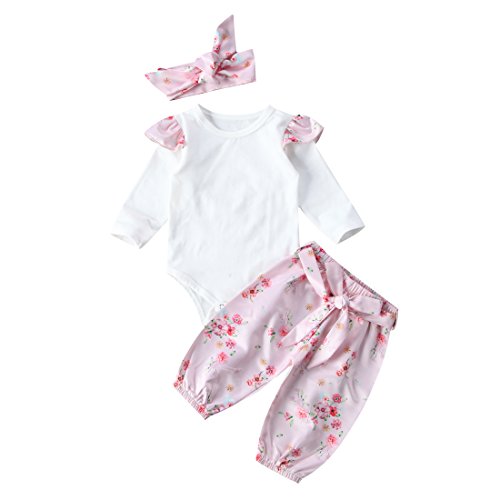トップス+パンツ+ヘッドバンド3点セット ベビーガールズ ベビースーツ 女の子 赤ちゃん服 ふわふわ飛び袖 ロンパース 花柄 パンツ (6-12M, ピンク)