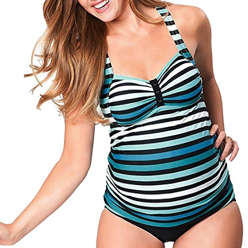 マタニティ水着 POTOJP オシャレ 大人 ストライプ柄 妊婦用 ワンピース水着 女性用 お腹カバー セパレート スイムウェア ママ水着 体型カバー 2点セット 産前産後兼用 写真記念 (L, ブルー)