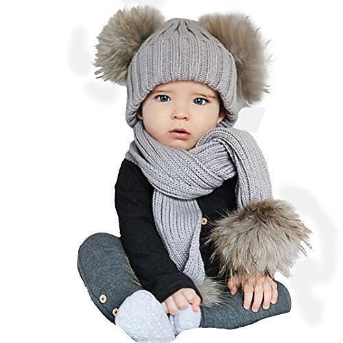 POTOJP 2点セット ニット帽 マフラー 韓国風 ベビー 無地 ポンポンボール付き 赤ちゃん帽子 女の子 男の子 秋冬 防寒・保暖 出産祝い/満月/クリスマスプレゼント (ダブルボール, GY)