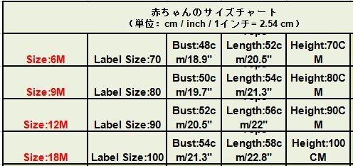 赤ちゃんのサイズチャート(単位:cm / inch / 1インチ= 2.54 cm)