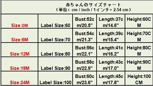 赤ちゃんのサイズチャート(単位:cm / inch / 1インチ= 2.54 cm)