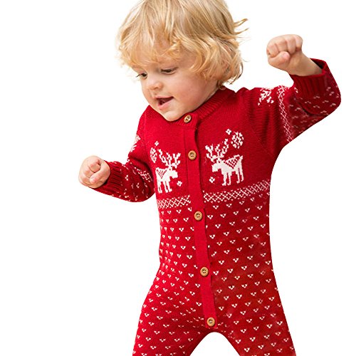 クリスマス 衣装 POTOJP エルク柄 ロンパー ベビー カバーオール 男女兼用 長袖 新生児服 ニット製 ボタン ロンパース 春秋冬 満月/出産祝い/普段着 (レッド, 70)