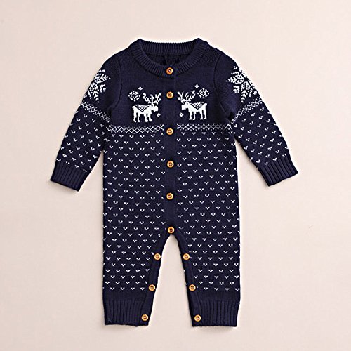 クリスマス 衣装 POTOJP エルク柄 ロンパー ベビー カバーオール 男女兼用 長袖 新生児服 ニット製 ボタン ロンパース 春秋冬 満月/出産祝い/普段着 (ダークブルー, 80)