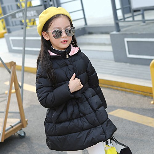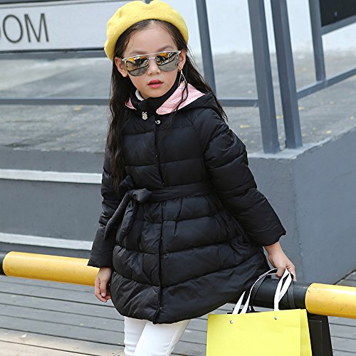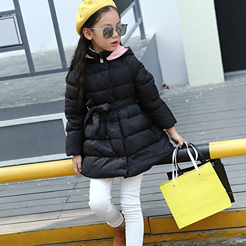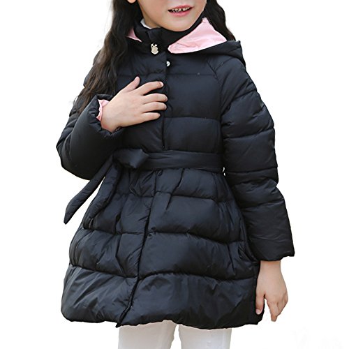 POTOJP オシャレ プリンセス風 ダウンジャケット 女児 キッズ服 ダウンコート 子供服 長袖上着 帽子付き ベルト付け アウター ジャケット 防寒 保暖 綿服 通学 普段用 (100, BK)