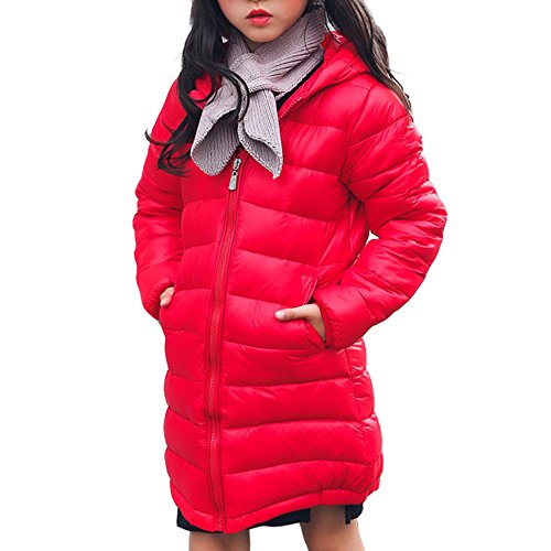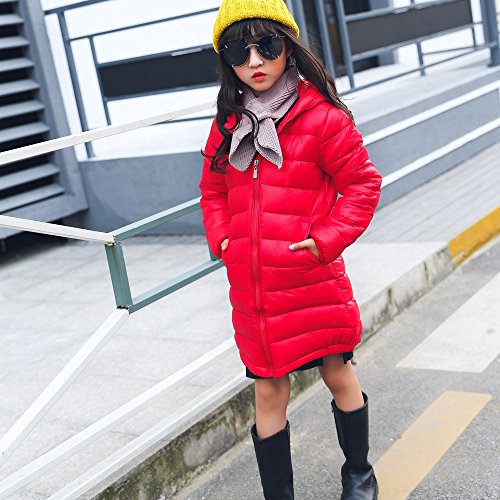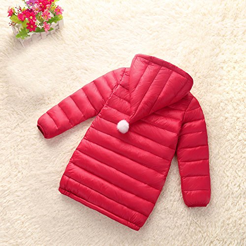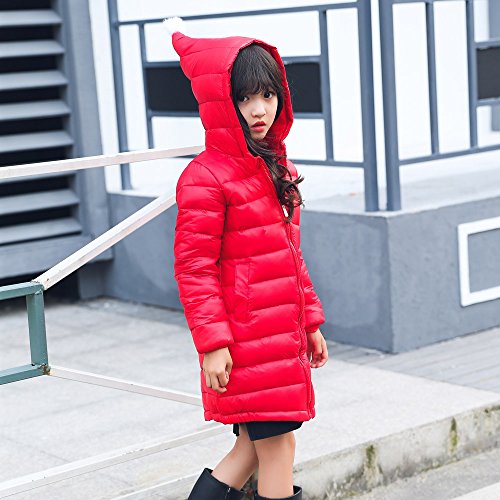 POTOJP 秋冬 韓国風 無地 ダウンジャケット キッズ 中綿コート ロング丈 軽量 あったか 防寒 ガールズ ポンポンキャップ付き 元気少女 防寒綿服 コットンジャケット 日常着 上着 (140, レッド)