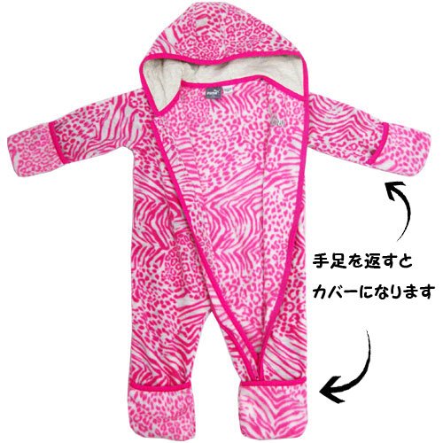 【アメリカ買付商品】 PUMA プーマ ベビー フリース カバーオール オールインワン - ピンク×グレー/0/3M=60~65cm 軽くて柔らかい、暖かフリース素材のカバーオール 手先と足先をひっくり返すと手足カバーになります。 サイズ:0/3M=60~65cm 3/6M=65~70cm 6/9M=70~75cm 9/12=75~80cm カラー:各画像にてご確認ください 素材:ポリエステル100% 洗濯表示:洗濯機可(※商品付属の洗濯表示をご覧ください。) 輸入国:アメリカ 生産国:中国