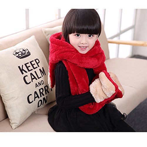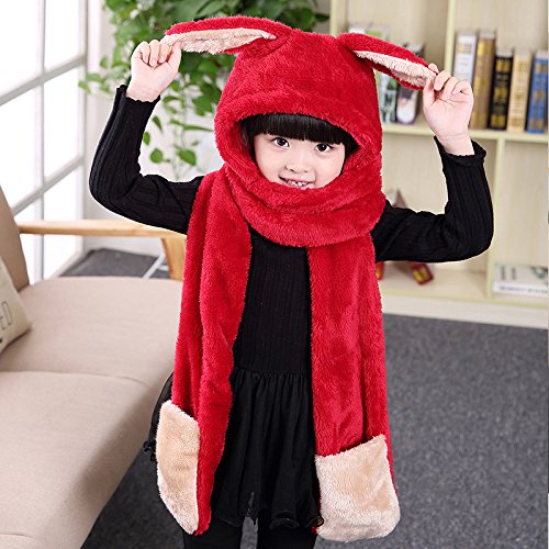 子供用 ウサギデザイン かわいい 多機能 帽子 マフラー 手袋 耳覆い機能 スカーフ グローブ ふわふわ 防寒対策 キッズ 女の子対応 ワンピース (レッド1)